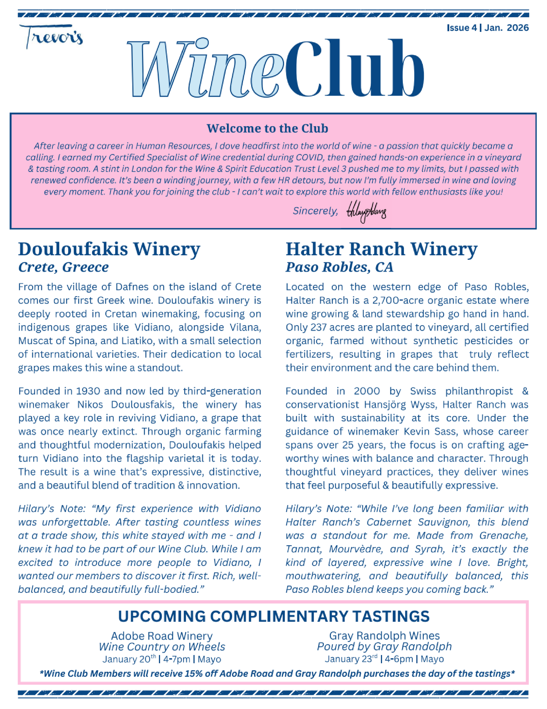 This immersive, high-energy tasting brings Sonoma County and Napa Valley wines directly to the event, led by the Adobe Road team. Guests will taste award-winning Racing Series blends along with small-lot Napa and Sonoma selections, showcasing the winery’s focus on structure, detail, and balance. This is a rare, turnkey wine-country experience—and a first for Trevor’s.